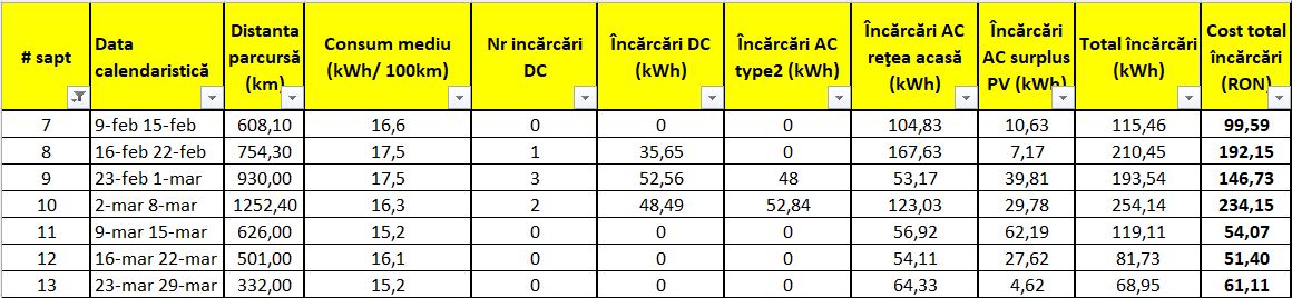 - energie încărcată: 53.19 kWh acasă din PV-uri dar și o încărcare la birou