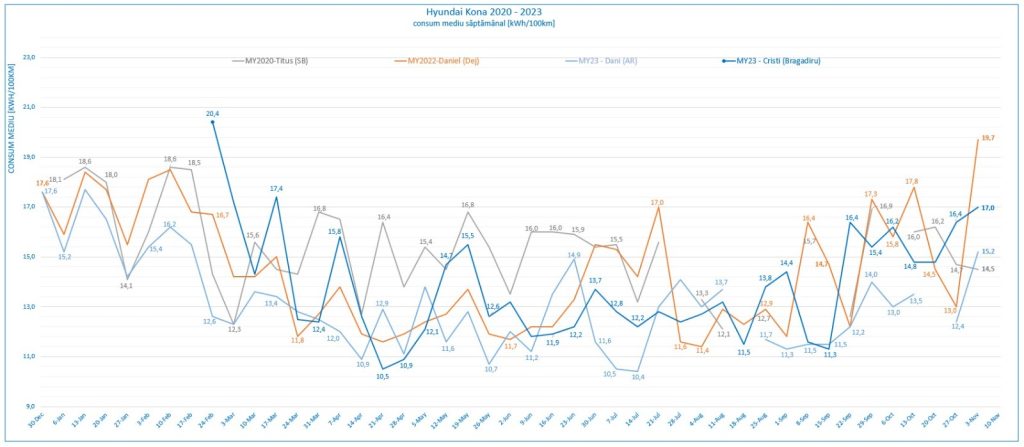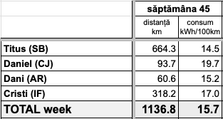 Per total creșterea mediei ponderate în echipa veteranelor e de la 15.2 kWh/100 km la 15.7 kWh/100 km. O creștere infimă de la o săptămână #44 mai caldă.