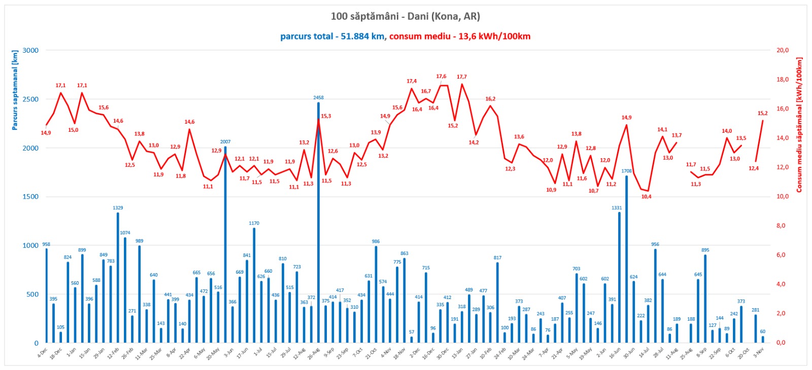 Săptămâna #45 ne aduce un parcurs de peste 1.100 km și un consum de 15.7 kWh/100 km.