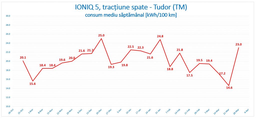 Consumul mediu pentru cei 10.000 km parcurși în sezonul rece a fost 19.7 kWh/100km și include drumuri pe autostradă, la munte pe temperaturi negative și mers în oraș.
