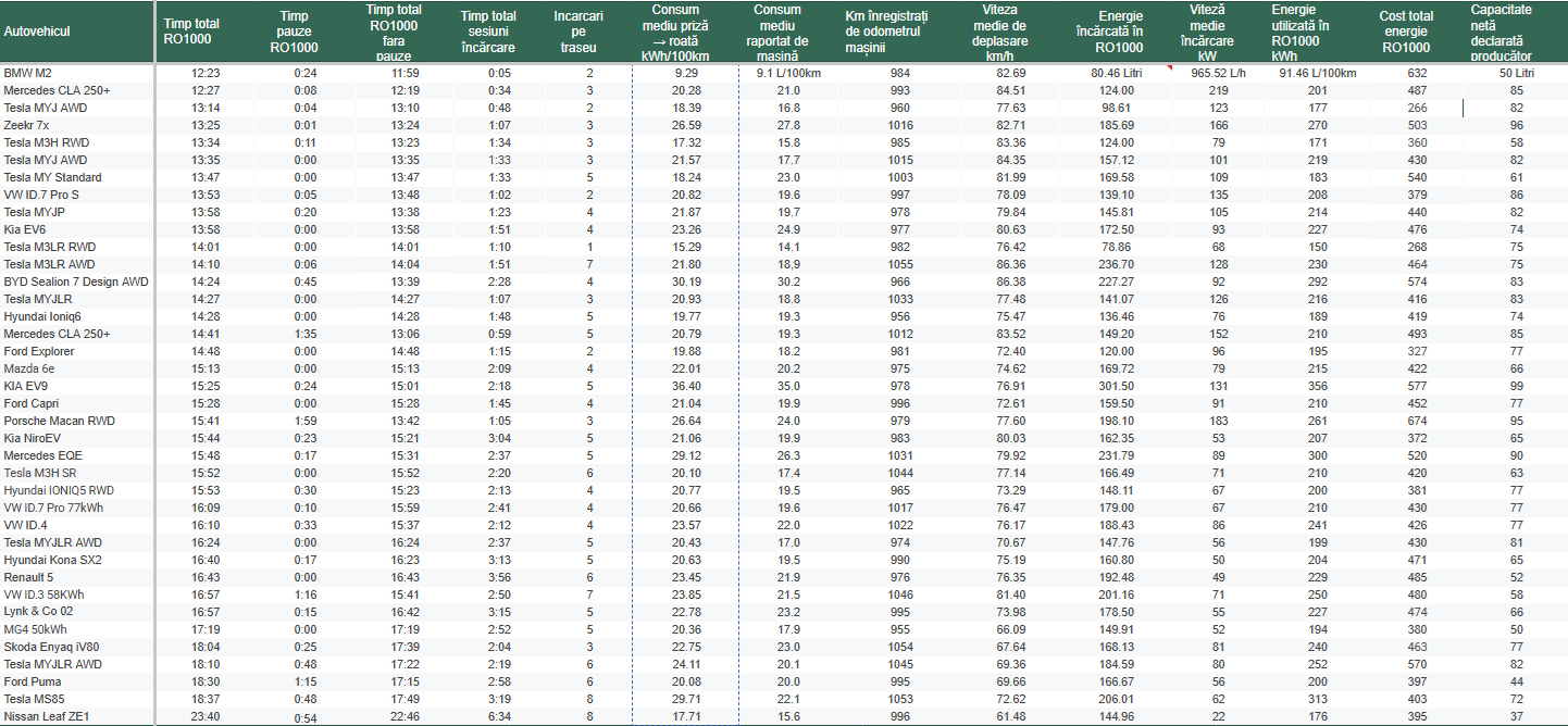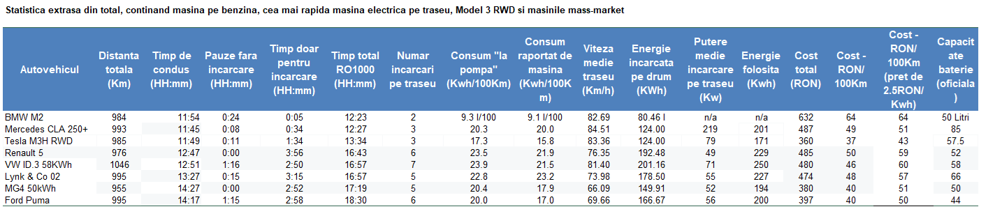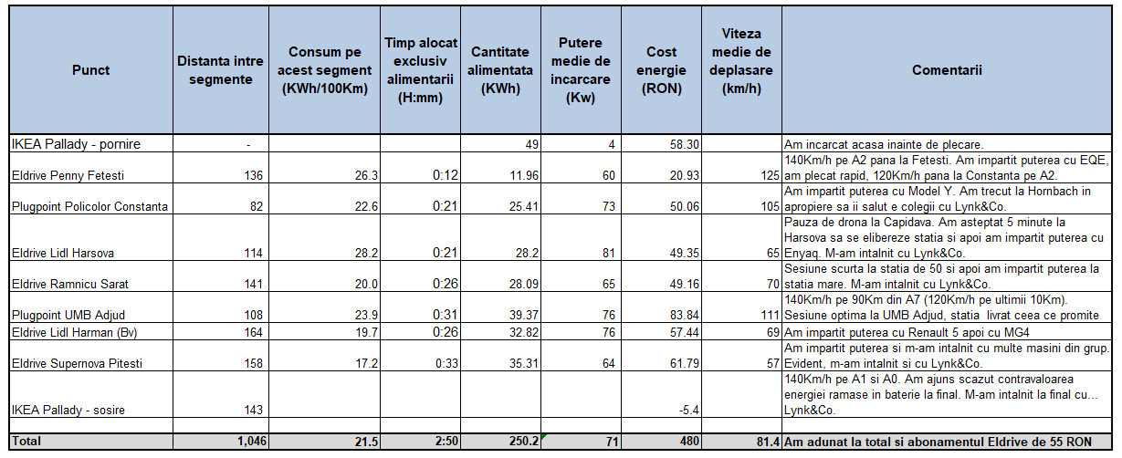 În tabel am prezentat costul total în RON, dar și costul/100 km, deoarece distanțele au variat în funcție de ocolirile făcute. Pentru o imagine mai clară, pe una dintre coloane am calculat costul/100 km folosind prețul generic de 2,5 RON/kWh pentru toată energia consumată pentru parcurgerea traseului.
