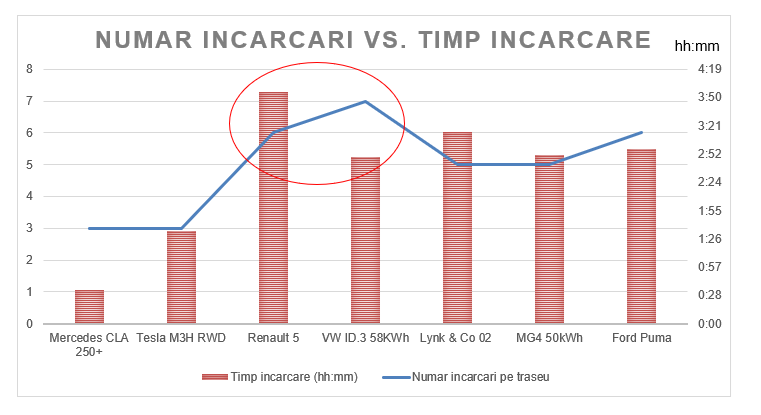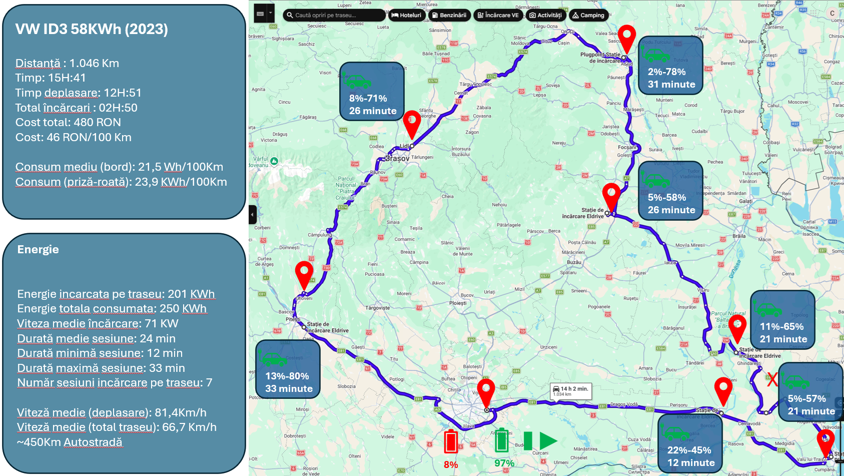 Încărcările multe nu înseamnă neapărat timp total mai mare de încărcare. Însă mai multe sesiuni până la 90%–100% cresc considerabil timpul total. ID.3 vs Renault 5: în situația de față, colegul cu Renault a avut două sesiuni până la 100% și două până la 95% pe traseu, dar a ajuns de câteva ori cu ~30% la următoarea stație, deoarece a preferat să aibă o marjă mai mare de siguranță. Iar Lynk&Co a încărcat până la 90% la Constanța și până la 100% la Focșani, când au luat pasagerii masa.