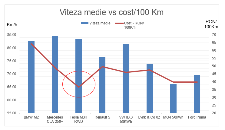 Mașinile mass‑market fac câte ceva din toate, dar nu excelează la vreun capitol anume. Așa că se simte foarte rapid efectul creșterii vitezei medii în costul total. Tesla Model 3 RWD și Mercedes CLA sunt ambele foarte eficiente, dar costul pentru CLA este mai mare decât la Tesla, deoarece a încărcat la stații cu prețuri mai ridicate (E-charge, OMV). Heads‑up: unele stații au început să practice prețuri diferențiate în funcție de putere.