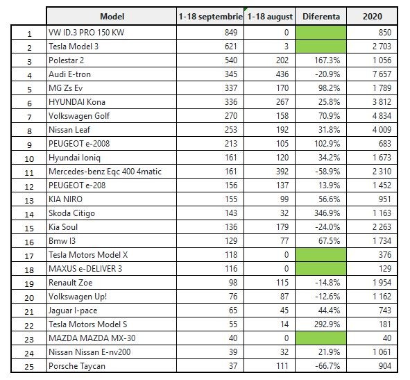 Alte patru modele (Tesla Model 3, Polestar 2, Peugeot e-2008, Skoda Citigo și Tesla Model S) au creșteri mai mari de 100% față de aceeași perioadă din august. Tesla este un caz aparte, fiindcă loturile produse pentru Europa, după redeschiderea activității la Fremont în luna mai, au ajuns în porturile europene doar în a a doua parte a lunii iulie.