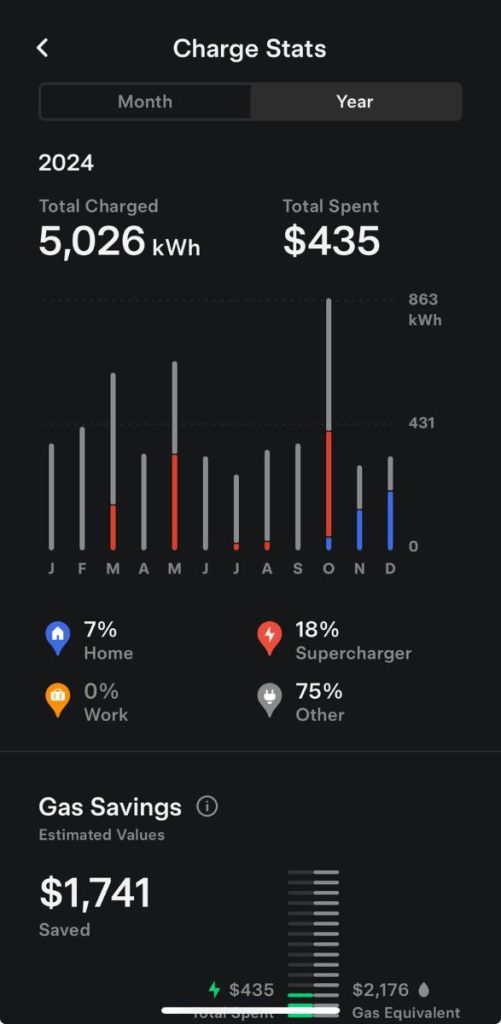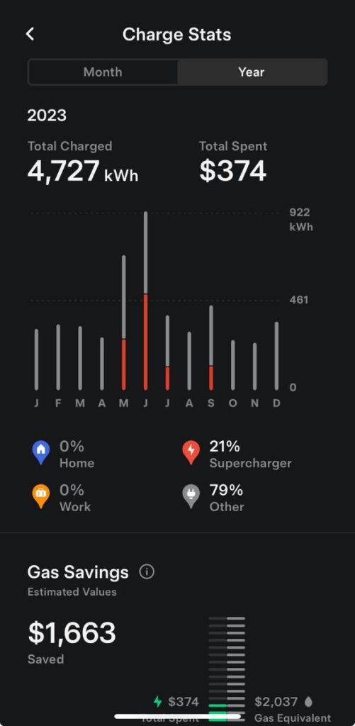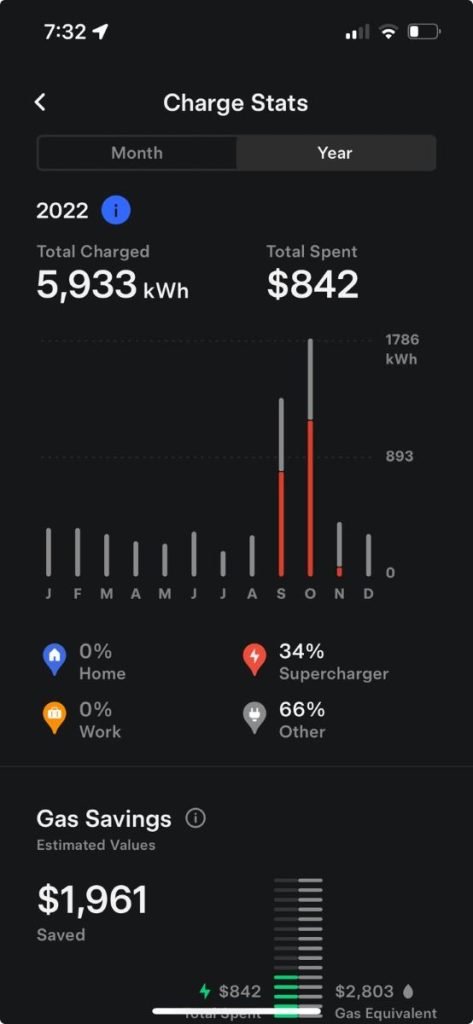 Începând din 2022, statisticile de încărcare pot fi accesate în aplicația Tesla, cu precizarea că majoritatea au fost efectuate acasă, iar cele rapide exclusiv în rețeaua Supercharger.