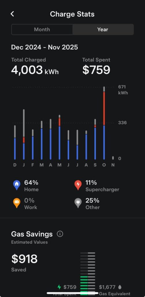 Pentru primele 10 luni din 2025, aplicația indică 25% energie din surse de încărcare „other”, deși în continuare încărcările zilnice le facem exclusiv la priza casnică din garaj, iar cele rapide la Supercharger.