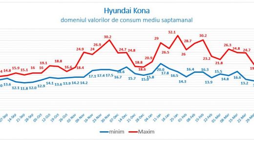 Consumul mediu săptămânal al Hyundai Kona s-a stabilizat astfel încât obţinem constant 400 km autonomie în condiţii normale de drum.