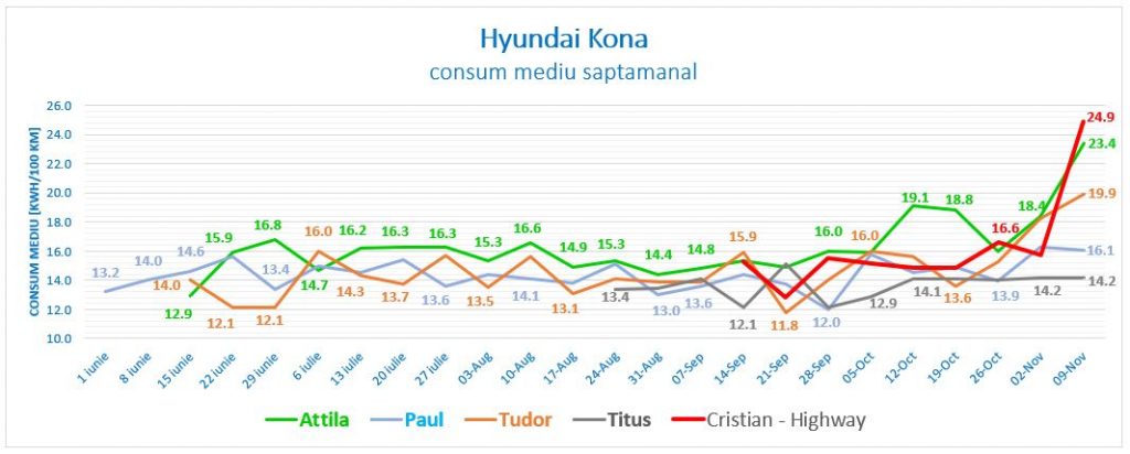 Un exemplu furnizat de Paul pentru Kona, arată valori zilnice de consum pentru drumuri scurte (4 si 11 km) de peste 20 kWh/100 km, în schimb valori mai mici, între 15.1 și 15.6 kWh/100 km pentru drumuri lungi, după ce acumulatorul și interiorul au ajuns la temperatura optima. Paul ne atrage atenția ca mașina lui nu beneficiază de protecția unui garaj, prin urmare plecările la drum se fac de la temperatura mediului.