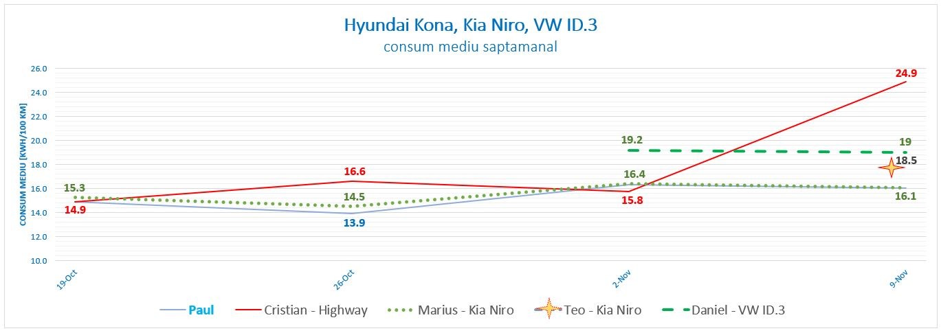 Informațiilor transmise de Daniel despre ID.3-ul său utilizat în Timișoara și Marius cu Niro în București, s-a alăturat prima valoare medie de consum săptămânal (marcată cu o steluță pe grafic) furnizată de Teo, noul nostru colaborator din București.