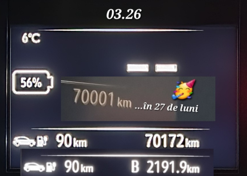 - Distanța parcursă: 312 km (53865 km – 51% SoC)