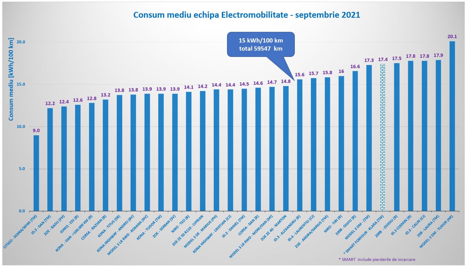 După aproape 60.000 km parcurși luna trecută de participanții la proiect, consumul mediu a fost 15 kWh/100 km.