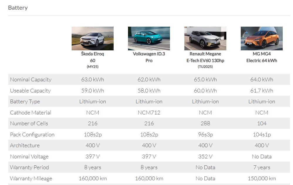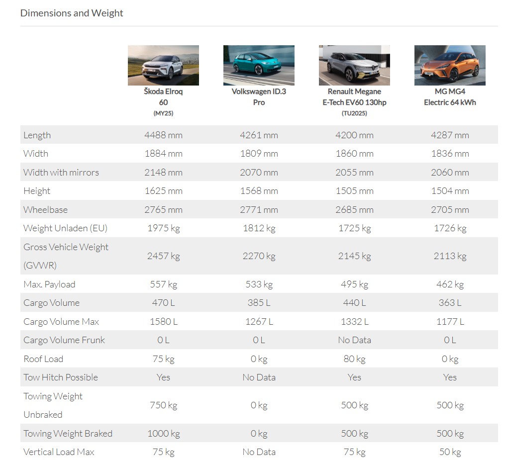 Din comparația oferită de EV database se vede cu ușurință că Elroq este mai mare (gabarit și portbagaj), dar și mai greu decât colegele de echipă.