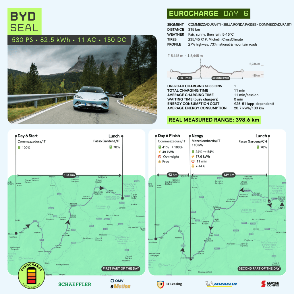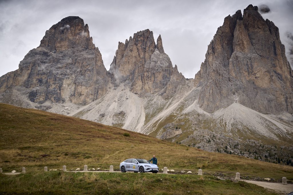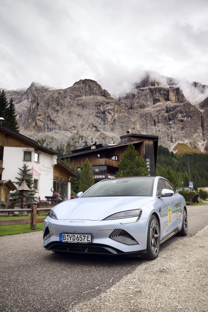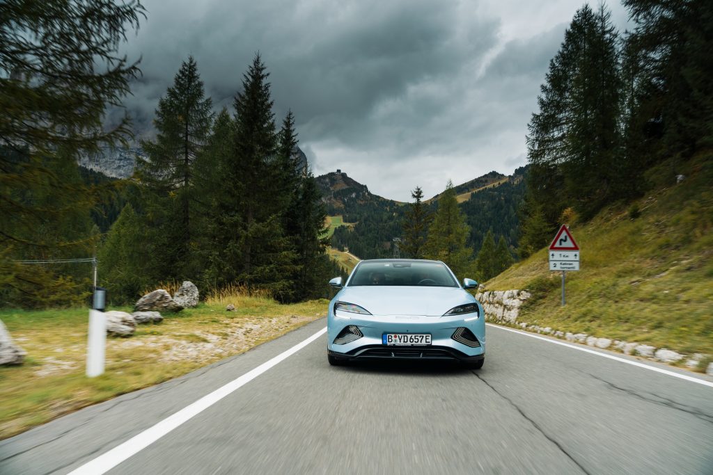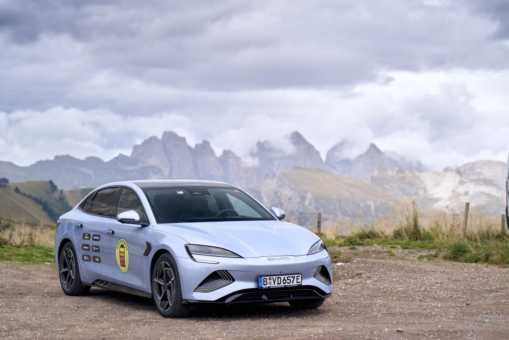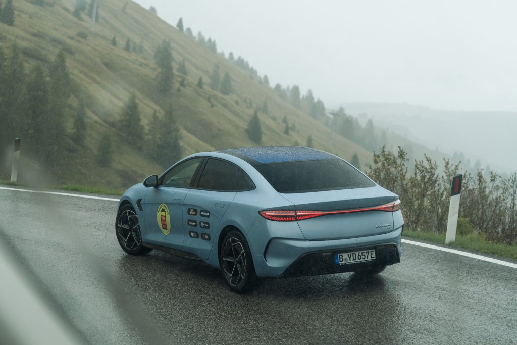 În Eurocharge 2025 am fost la volan pe traseul Commezzadura (IT)–Sella Ronda Passes–Commezzadura (IT), pe vreme ploioasă și 5-15 °C, pe un traseu format predominant din drumuri de munte (75%, 25% autostrăzi). La finalul zilei datele de pe bord au arătat 318 km parcurși, cu un consum mediu de…nu știm sigur, fiindcă BYD este singura mașina la care Trip Computer-ul nu arată aceste informații. Poți vedea ori consumul mediu de când a ieșit mașina din fabrică, ori consumul pe ultimii 50 km (complet irelevant atunci când variază relieful). Pe baza capacității bateriei și a ce am încărcat la stații, consumul mediu ar fi undeva la 20.7 kWh/100km, cu tot cu pierderile de încărcare de la stație. Asta se traduce într-o autonomie reală de 398 km.