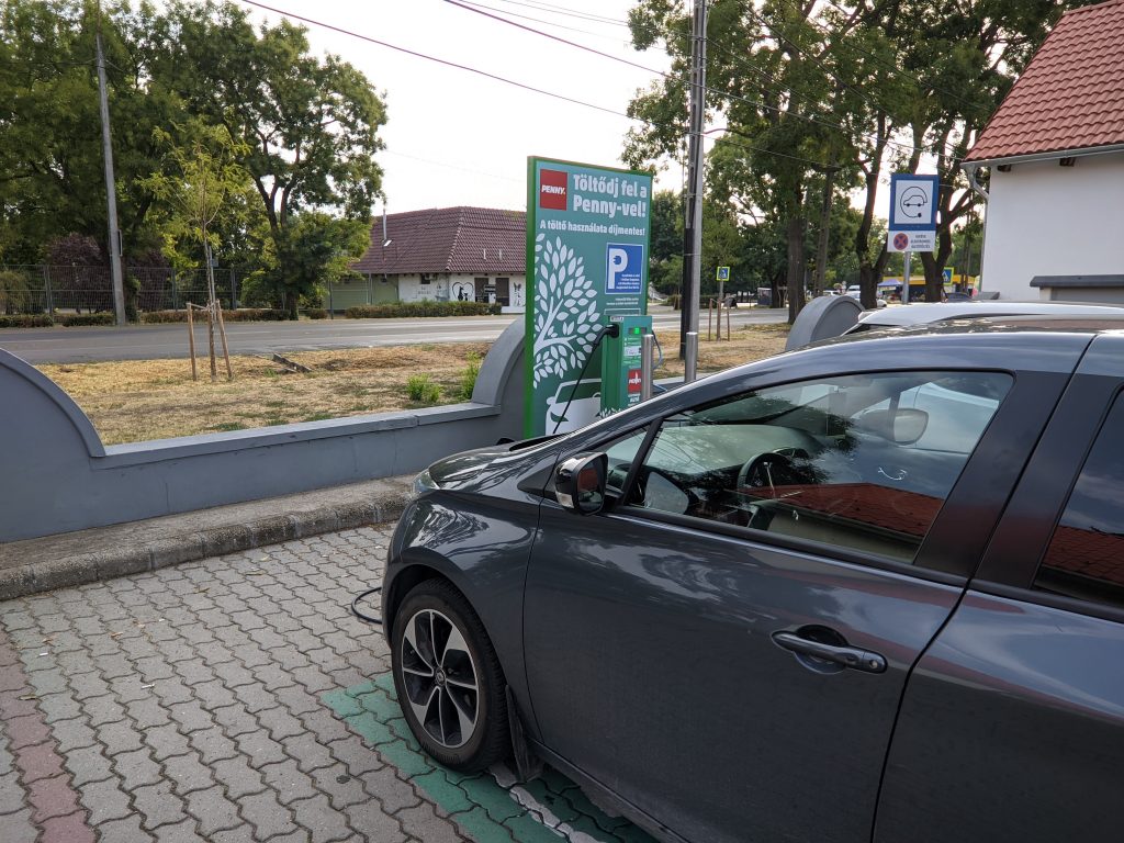 Drumul a fost fără evenimente și am ajuns la timp. Am pus mașina la încărcat inițial la un Lidl, dar stația era setată să funcționeze doar 10 minute, după care trebuia să recuplezi. Dacă porneai din aplicație atunci funcționa 30 minute. App-ul nu l-am putut downloada, pentru că era geofenced pe Ungaria. Cănd ești în roaming tot cu IP de Romănia ești. Măcar acest lucru este trecut pe un afiș.
