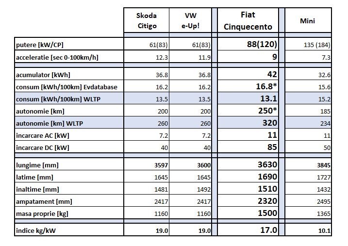Spre aducere aminte, tabelul cu competitorii, care va trebui cât de curând actualizat cu Honda e, Renault Twingo și Dacia Sprint.