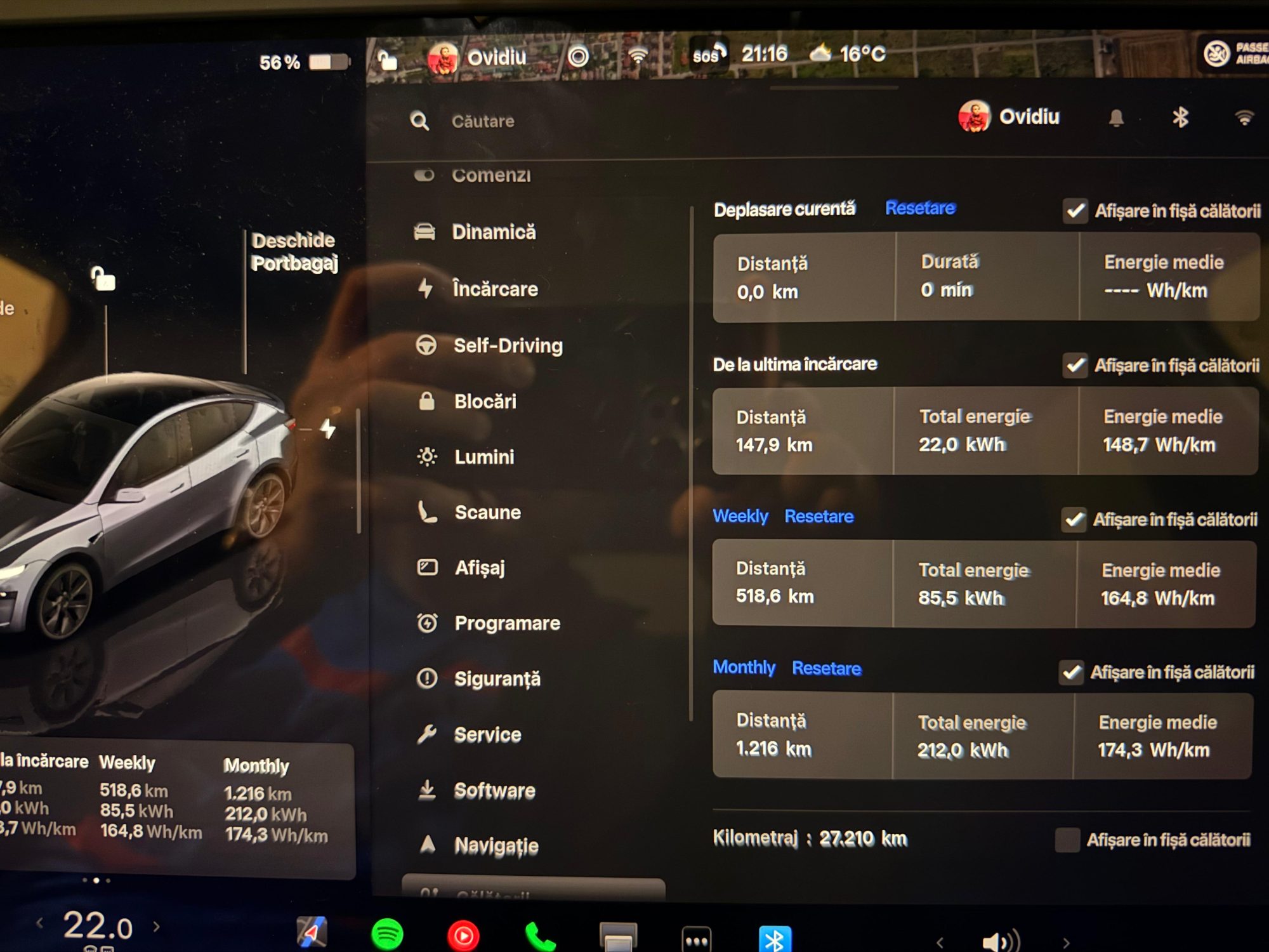 Săptămâna trecută am parcurs cu MYJ 518,6 km cu 85,5 kWh energie totală și o medie de 16,4 kWh/100km. Aproximativ 130 km au fost făcuți în regim extraurban iar restul prin oraș și avem o viteză medie de 29 km/h conform TeslaMate.