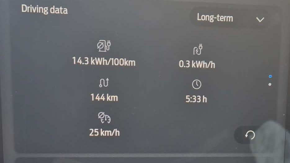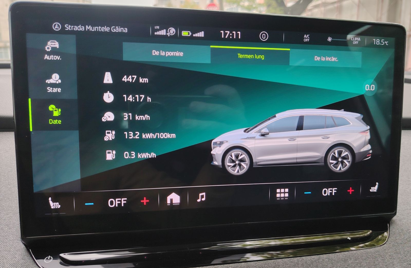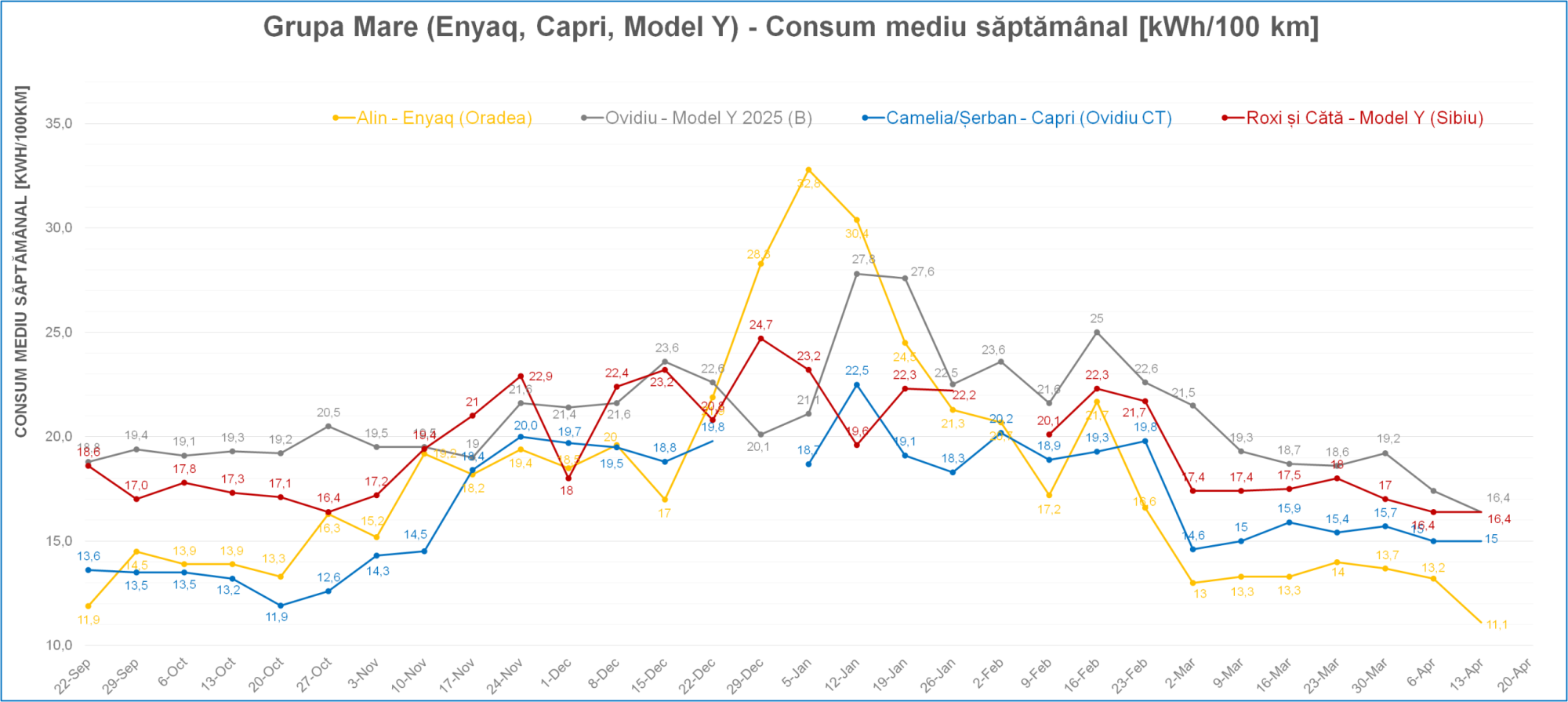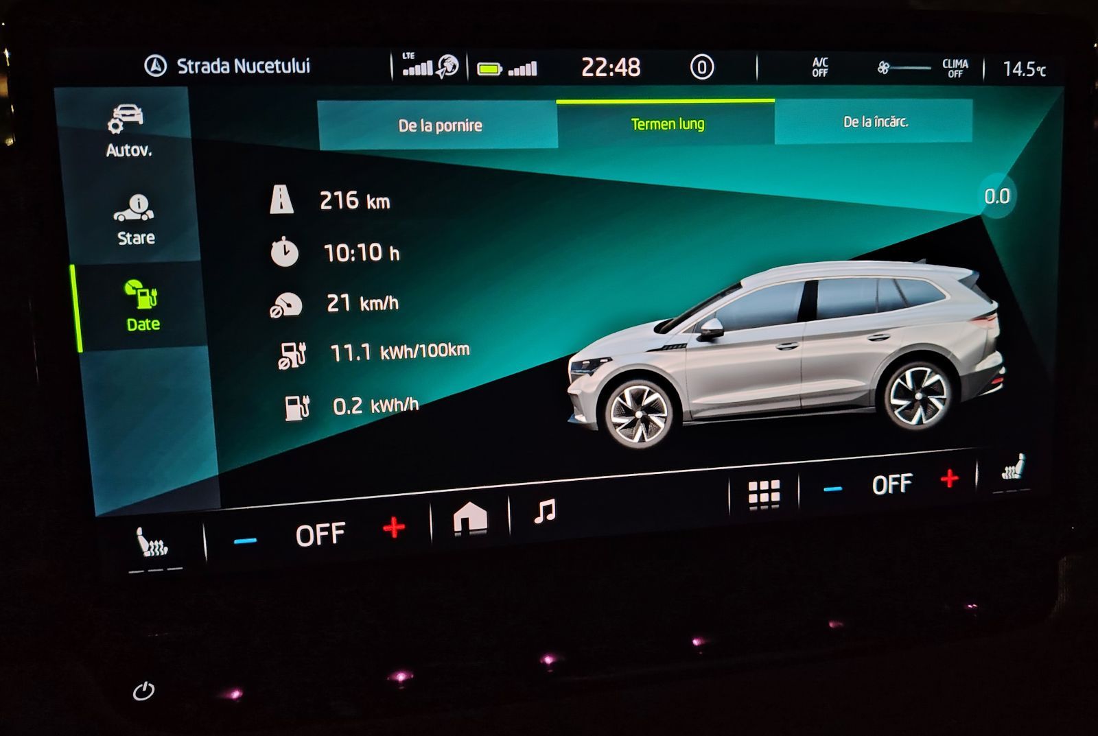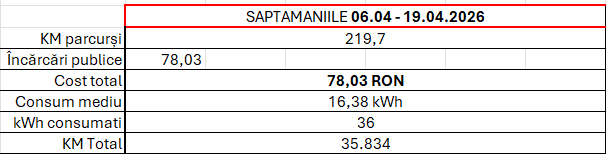 Ținând cont că la începutul săptămânii am avut 100% SOC, iar duminică seara am avut unica încărcare până la 80% SOC, ar ieși un consum de aproximativ 15 kWh/100 km.