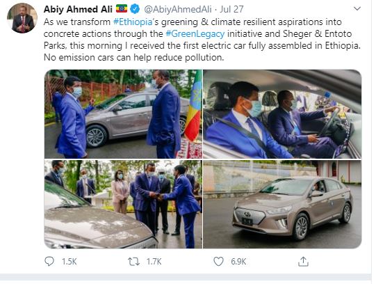 Într-un tweet postat luni, 27 iulie, primul ministru anunța recepția unui Hyundai Ioniq electric asamblat în Etiopia de Marathon Motor, o firma locala aparținând unui celebru campion de atletism olimpic si mondial.