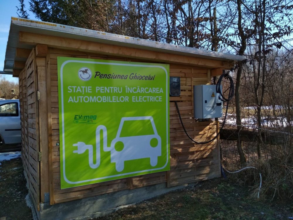 Revenim la pensiune dupa aproximativ o ora. Inainte de a ne aseza la masa, pentru pranz, ne intalnim cu proprietarul Pensiunii Ghiocelul. Il intreb despre statia de incarcare a masinilor electrice. Aflu ca e instalata din vara anului 2019, la sugestia unui vechi colaborator de-al sau, Ciprian Cherciu din Bucuresti, proprietar de masina electrica si promotor bine cunoscut si apreciat al electromobilitatii in Romania.