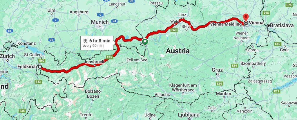 Între Viena și Feldkirch sunt pe șosea 630 km după Google Maps, deci revine 0,063 euro pe km costul “deplasării” cu Autoreisezug! Desigur costul de mai sus nu include cușeta celor patru pasageri, care a fost extra 360 euro pentru vagon de dormit.