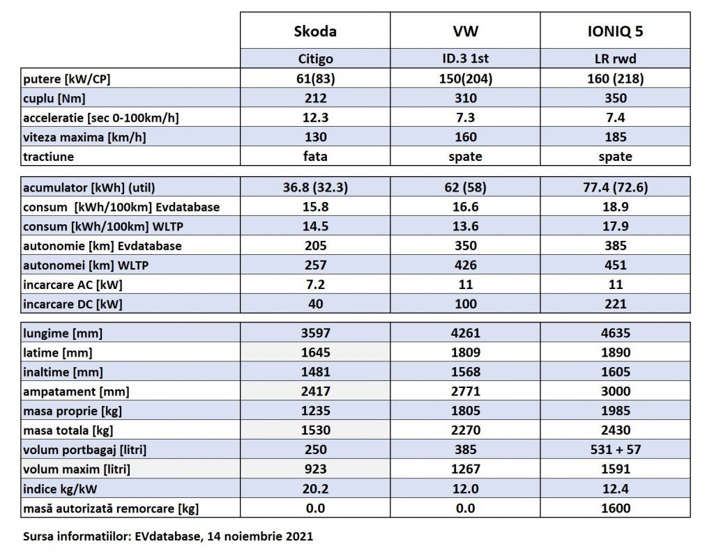 Pe baza specificațiilor culese din EVdatabase este ușor de observat cât de mari sunt diferențele de gabarit între cele trei modele, dar asta nu ne-a împiedicat să ne aliniem, cu Citigo în frunte, pe autostrada spre Lugoj, pentru a înțelege diferențele de consum ce rezultă din aria frontală, coeficientul aerodinamic și masa diferită.