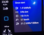 Consumul , începând din ziua încărcării, 22.1 kWh/100 km, tot cu deplasări scurte. Drive : Eco , Temperatura Habitaclu : 19 °C . Drum Urban 100% . Temperatura exterioară medie : 0*- 10*C . (imaginea din dreapta)