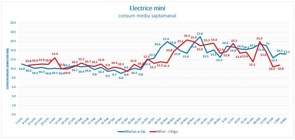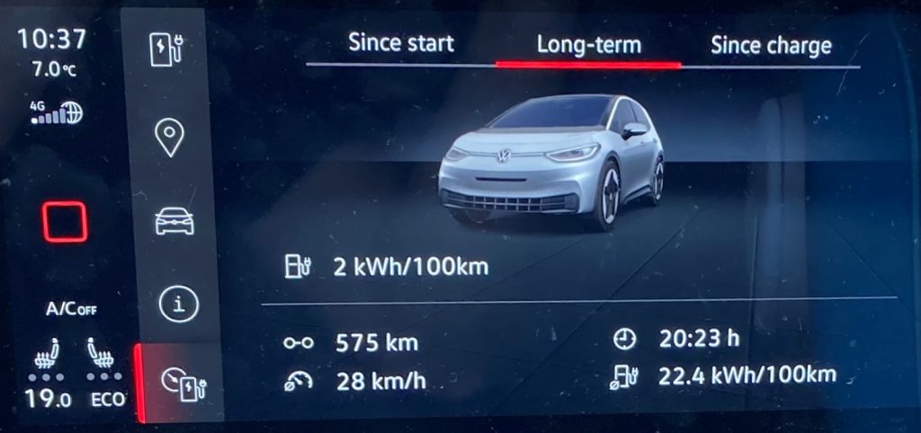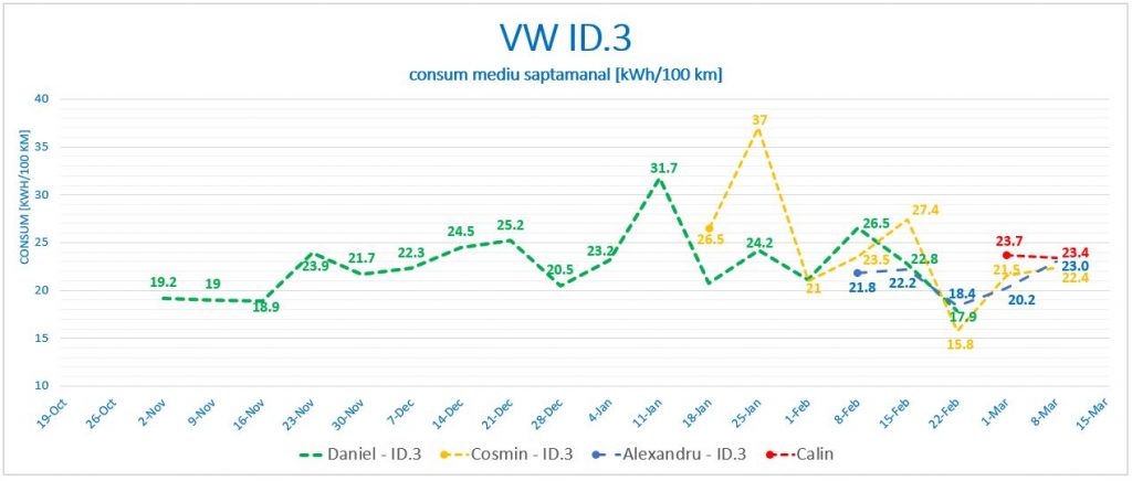 Eu din păcate nu am date nici pentru săptămâna aceasta. ID.3-ul meu a luat drumul service-ului fiind lovit de bateria de 12V descărcată. Îmi pun speranțe în update-ul de soft, dar feedbackul oferit de cei ce l-au făcut nu este încurajator.