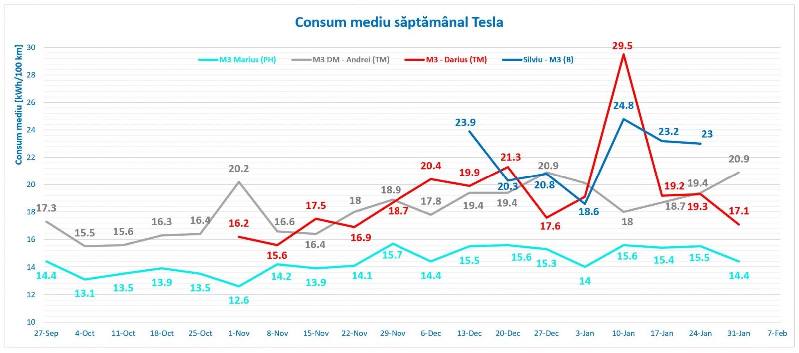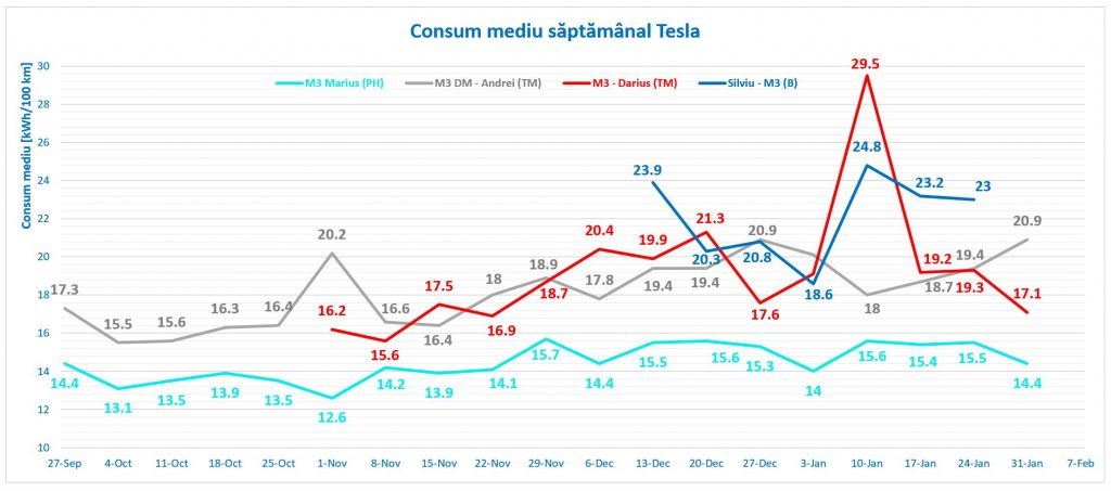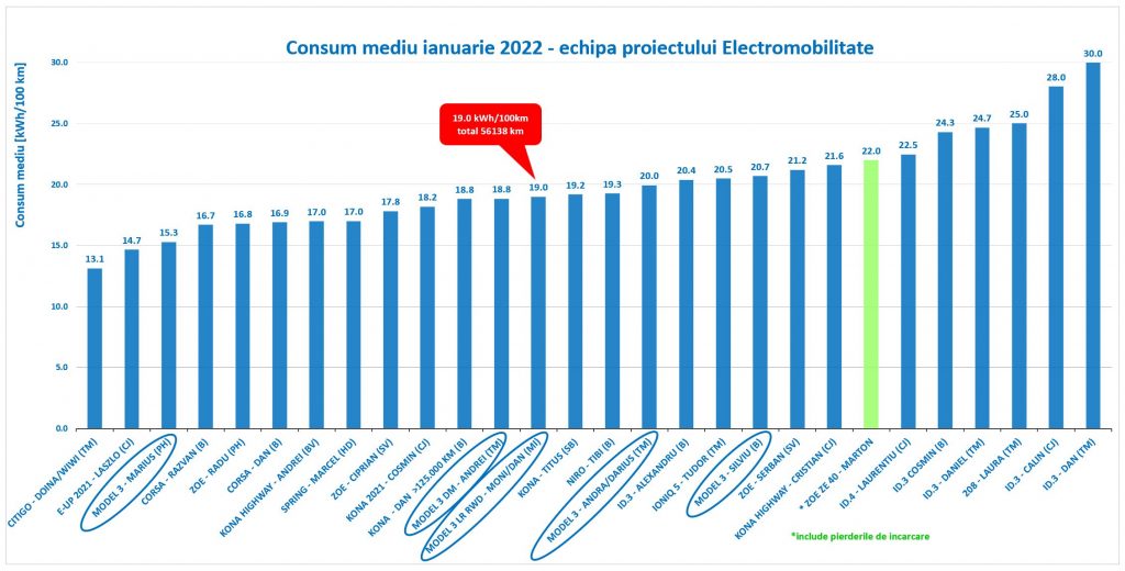 Comparând consumul mediu din luna ianuarie, cu cel al întregii echipe angrenate în proiectul Electromobilitate, găsim patru Model 3 în mijlocul clasamentului, singura excepție fiind Marius (PH), care având deprinderile la volanul unei electrice formate după un an de experiență cu e-Up, obține valori de consum remarcabile pentru acest sezon.