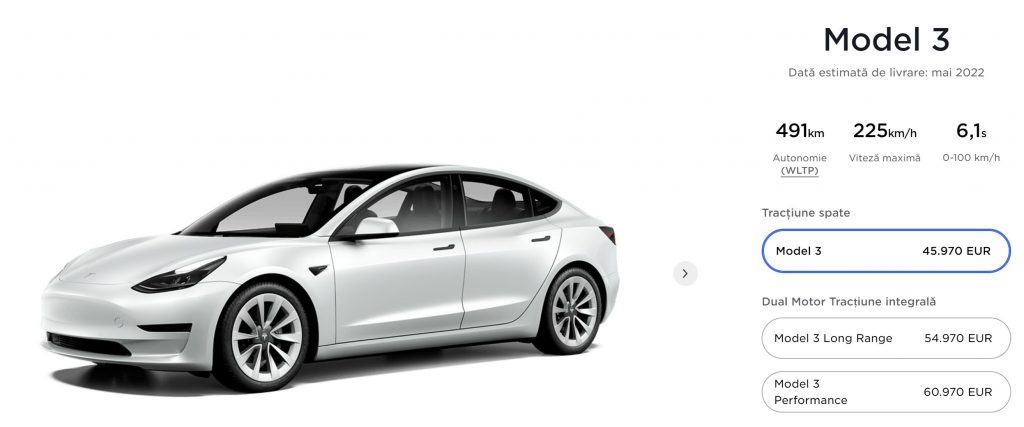 După repetate majorări de preț, oferta actuală (6 februarie) pentru Tesla în Romania pornește de la 45.970 Euro pentru modelul de bază, cu termen de livrare estimat în luna mai. După subvenție, în funcție de opțiuni, prețul de pornire se învârte în jurul valorii de 36.000 euro, ceea ce devine foarte atractiv, în combinație cu rețeaua de încărcare Super Charger aflată în extindere în Cluj și Brasov, pe lângă axa Timișoara-Sibiu-Pitești- București- Constanța inaugurata în 2021.