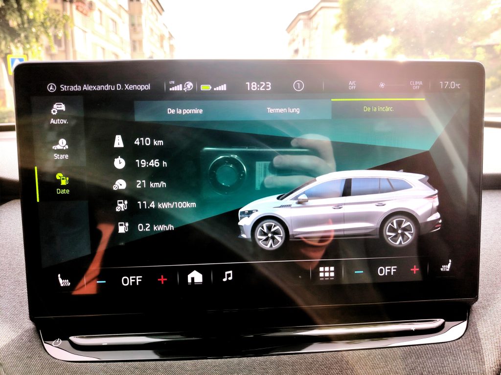 Chiar dacă în lumea paralelă a electromobiliștilor există tendința de a stoarce ocazional consumuri cât mai mici, ca o subliniere a eficienței superioare pentru tracțiunea electrică, Alin se menține de patru săptămâni sub 12 kWh/100km, ceea ce este cu totul remarcabil pentru o masina de talia Enyaq-ului și un avantaj pentru buzunar, atunci când încarci doar în rețele publice, așa cum procedează colegul nostru.