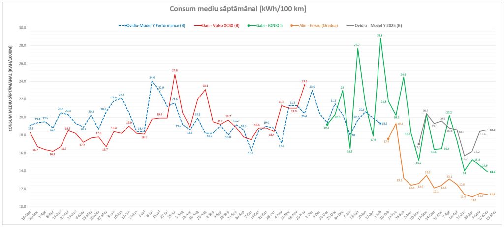 Săptămâna 12 – 18.05.2025 am continuat un experiment început săptămâna precedentă cu Skoda Enyaq iV60 și anume o încercare de a merge două săptămâni fără încărcare. Dar vineri am fost obligat să încarc, fiindcă SoC coborâse la 8% și mai aveam câteva drumuri de parcurs până duminică seara, momentul ales pentru resetarea contoarelor în echipa noastră.