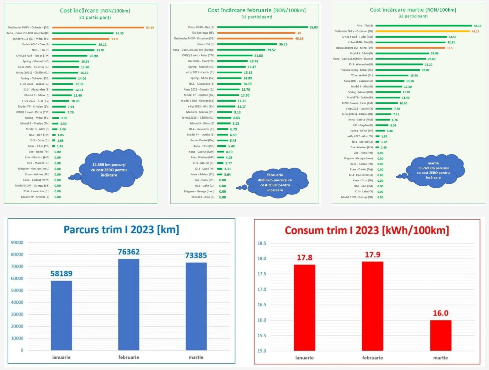 Probabil cel mai neașteptat aspect al bilanțului pentru luna martie a fost creșterea numărului colegilor care au comunicat costuri ZERO cu încărcarea. In contextul discuțiilor continue și foarte zgomotoase online, despre reducerea numărului de stații gratuite, colegii noștri au beneficiat de încărcare la locul de muncă, de energia electrică produsă cu propriile panouri solare și de cele câteva oportunități fără costuri directe oferite de unele primarii, centre comerciale și locuri de cazare.