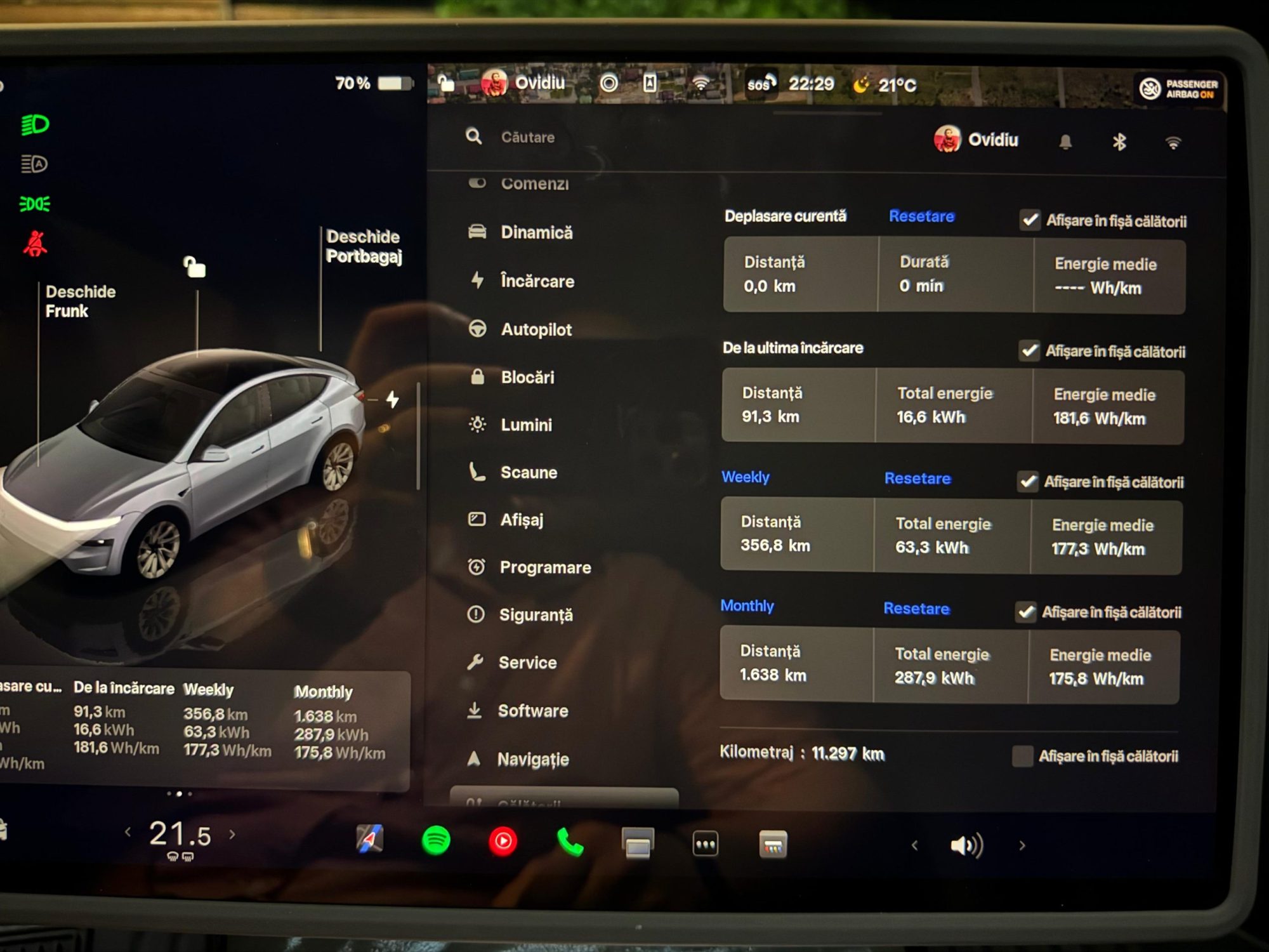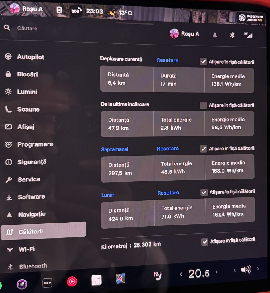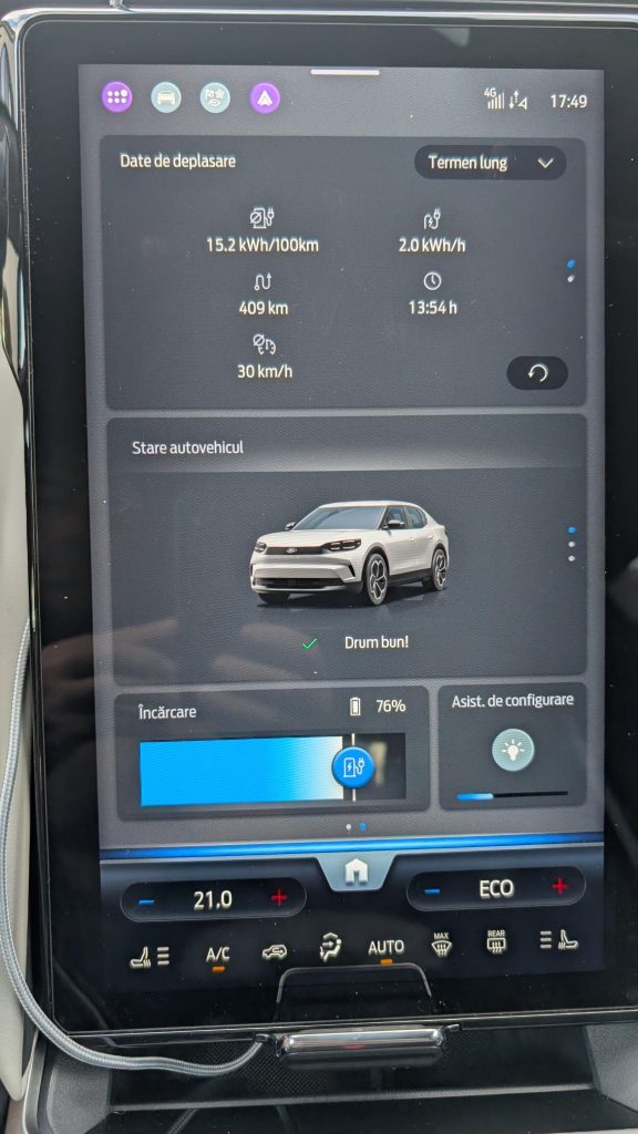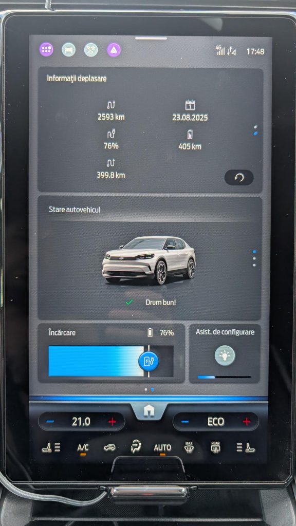 Navetă Ovidiu–Constanța și un drum pe DN. Vizită la service pentru update software la In Board Charger, care a rezolvat problema resetării datelor după încărcare AC.