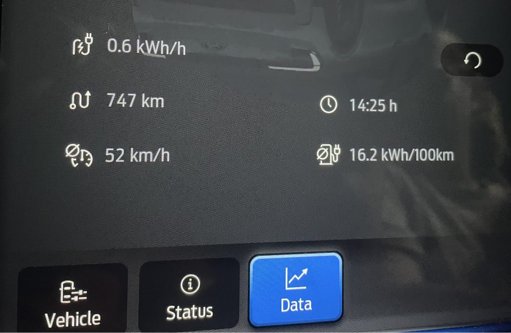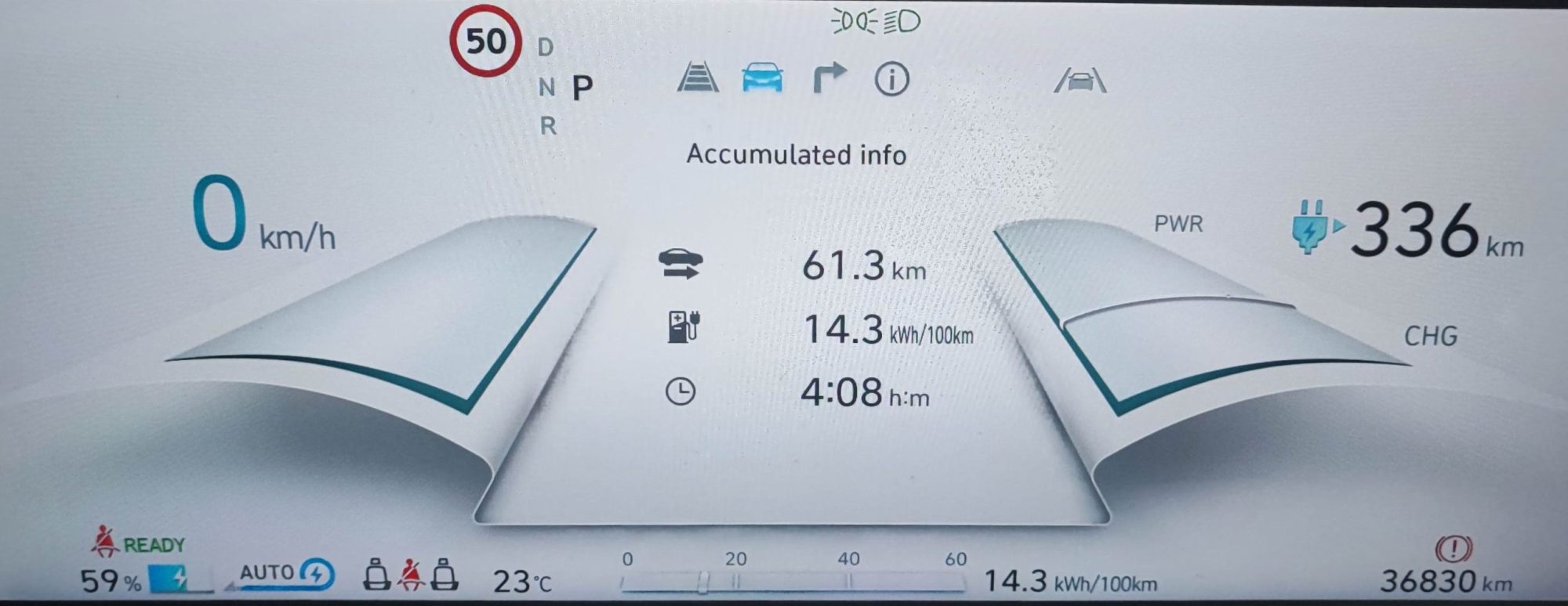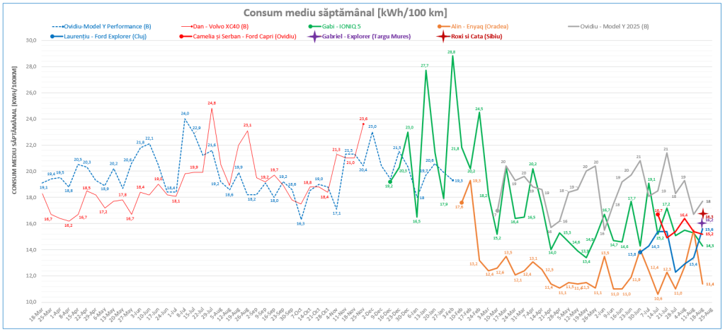 „Pana vineri, am avut doar drumuri prin oraș, la temperaturi mari de 33-35 grade, am folosit si clima puțin mai intens. Iar pe weekend, am făcut două drumuri in Păltiniș, totalizând aproape 300 km, cu un consum mediu de 16,3 kWh/100km. Tin sa menționez, ca mașina este echipata cu cauciucuri de iarna, așa am achiziționat-o. Per total, de când avem mașina, am totalizat in jur de 1500 km, și este totul super.
