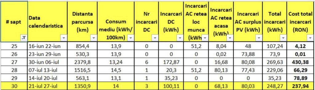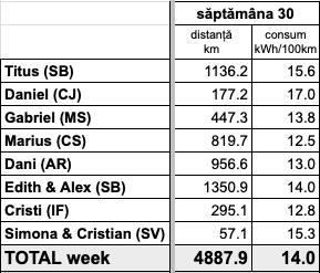 Săptămâna #30 aduce un parcurs de peste 4.800 km în echipa #konițelor. Consumul este unul care ne arată foarte clar faptul că mașinile nu au stat. 14 kWh/100 km este o medie ponderată în care cântăresc foarte mult distanțele efectuate spre destinații de vacanță.