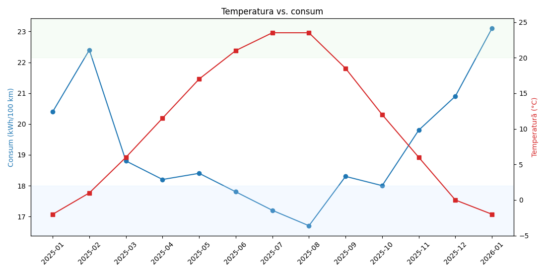 Diferența este de 30–40%, exact ceea ce raportează majoritatea utilizatorilor de EV. Corelarea consumului cu temperatura exterioară este evidentă.