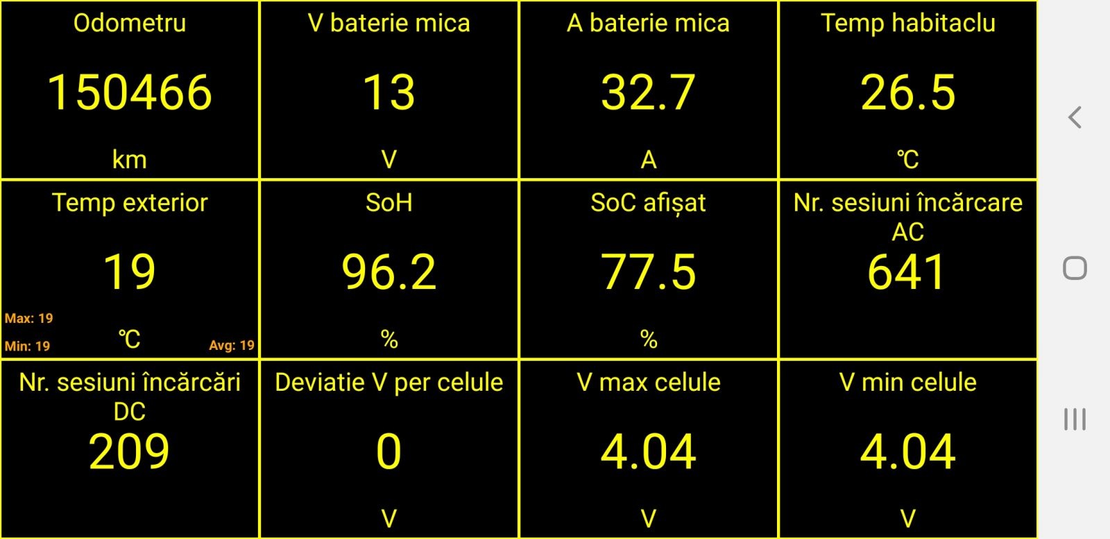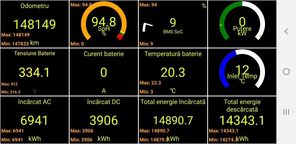 - SoC – [BMS] State of Charge BMS (%) – exprimă procentual nivelul de încărcare al bateriei. Și este liniar. Atenție că acesta diferă de ce este afișat în bordul mașinii. Valoarea din bordul mașinii este extrapolată defapt la acest parametru, suprapunându-se ca valoare pe la 20%.