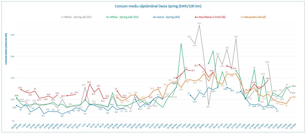 Singurul care alimentează în rețele publice este Alexandru (Aiud), care a parcurs în primele patru luni ale anului 9599 km cu un consum mediu de 14.2 kWh/100km și cheltuieli de 23 lei/100km.