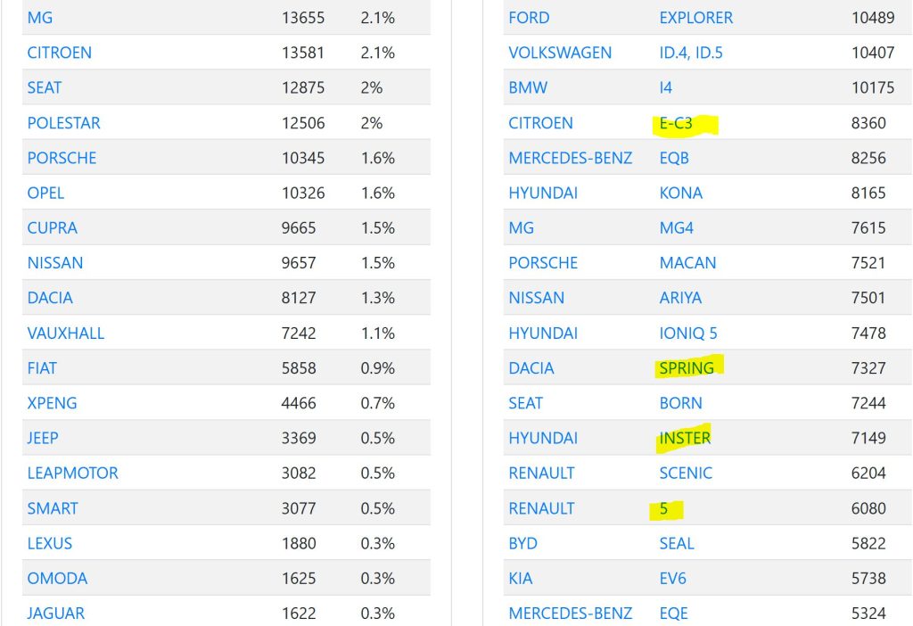 - In schimb, pe următoarele 15 locuri din clasament găsim Citroen E-C3 plasat înaintea Spring-ului, urmate de Inster și Renault 5.