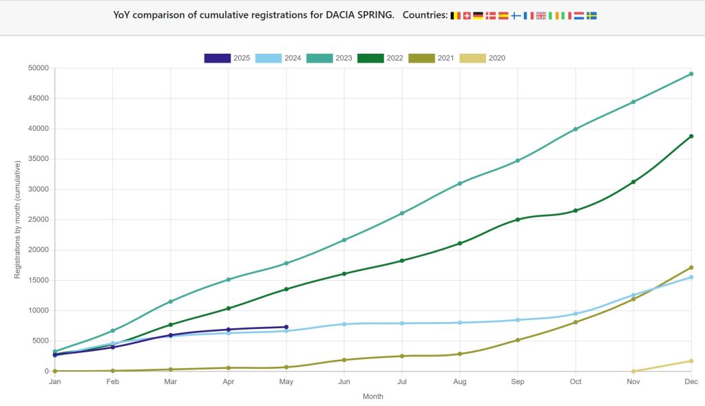 Chiar dacă împovărat de taxele suplimentare aplicate mașinilor produse în China, Spring-ul nu mai atinge TOP 10 al clasamentelor europene anul acesta, înmatriculările sunt cu o idee mai bune față de aceeași perioadă din 2024 (înainte de taxe).