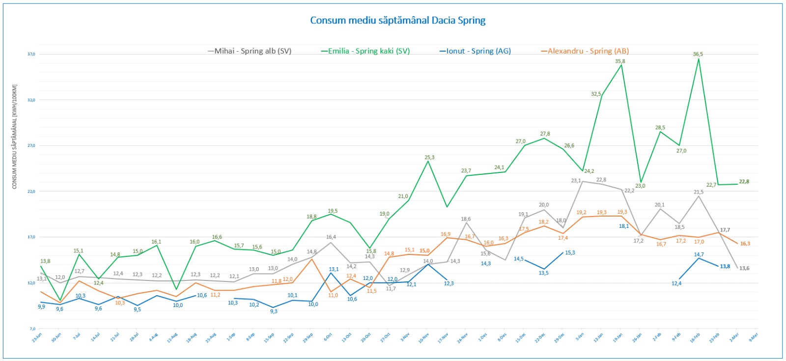 - Număr încărcări: 1 încărcare acasă ( 23 kWh ) cu aport 100% solar.