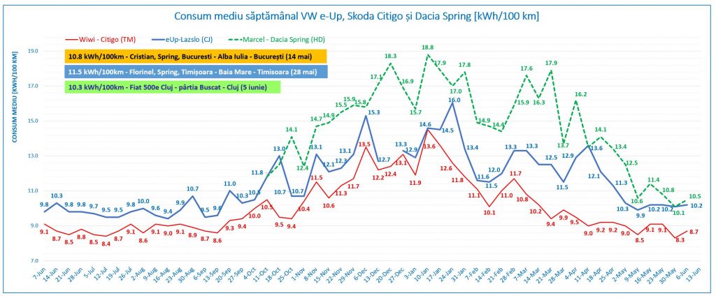 Pe lângă trei colegi ce trimit informații săptămânale despre parcurs, consum, cheltuieli și condițiile în care au fost obținute aceste valori, am listat pe grafic valorile transmise de trei invitați. Încercăm să demonstrăm că indiferent dacă vorbim de Citigo, e-Up, Spring sau Fiat 500, consumul nu trece în această perioadă de 11.5 kWh/100 km, ceea ce menține costurile de încărcare extrem de scăzute, comparativ cu orice altă forma de deplasare, inclusiv transportul în comun.