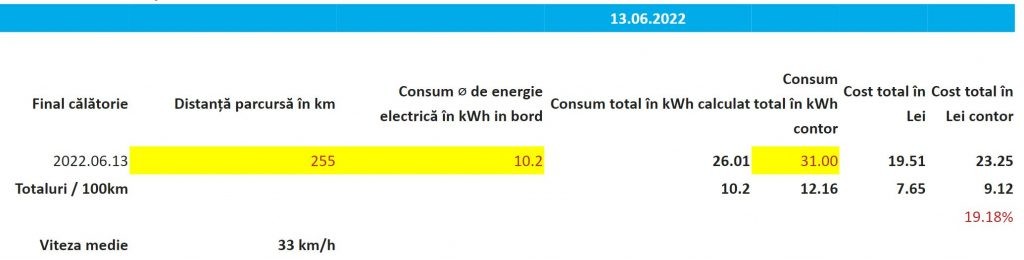 Consumul pe ceas este tot 10.2 kWh/100km, pierderile oscilează, dar ne situăm tot în jurul sumei de 9.12 lei/100km (inclusiv pierderi de încărcare).