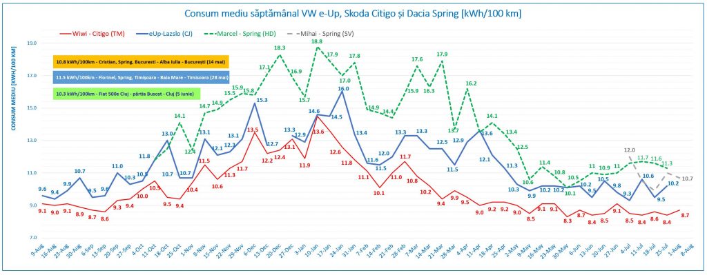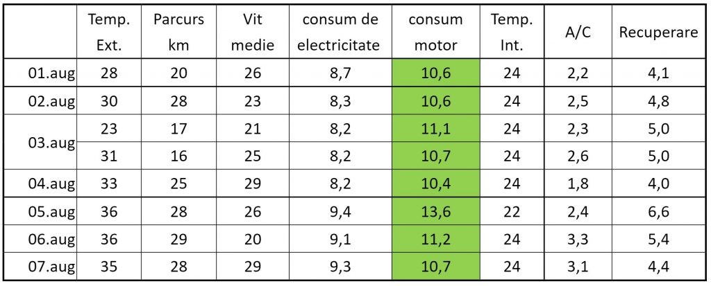 Finalul de săptămână cu trei zile peste 35 C a ridicat consumul pentru AC și în final pe cel mediu pentru întreaga săptămână, dar Citigo rămâne consistent mai economică decât Dacia Spring.