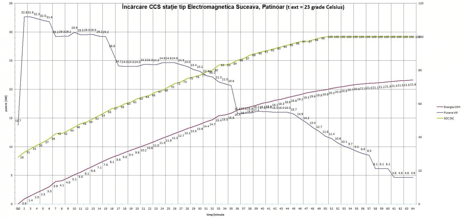 Cu atât mai interesați am fost de informațiile primite de la Mihai, care continuă munca minuțioasă de înregistrate a curbelor de încărcare pentru Dacia Spring la diferite stații, temperaturi și stări de încărcare ale acumulatorului.