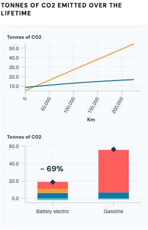 Producția mașinii electrice și a bateriei, dar și utilizarea acestei mașini vor elibera 75 gCO2/km în atmosferă. În schimb o mașină tradițională va emite peste 246 gCO2/km la care se adaugă poluanții suplimentari sintetizați în combustibili și în uleiurile consumate zilnic.