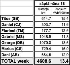 #konițele parcurg distanțe considerabile în fiecare lună. Datele pentru săptămâna #18 se observă în tabelul alăturat. Peste 4.600 km cu un consum mediu de 13.4 kWh/100km.