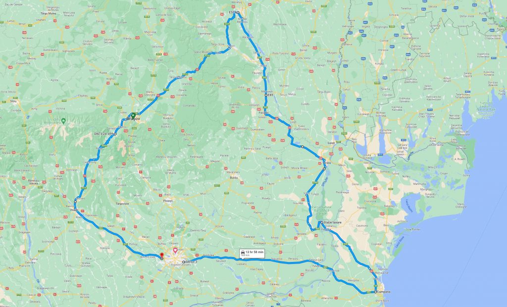 Dintr-un motiv foarte simplu: la prima participare, persoanele disponibile pentru acest test am fost eu, Paul, Alex și Cosmin. În mod natural, punctul nostru de convergere a fost Bucureștiul. Iar traseul care a corespuns criteriilor de mai sus, este cel din imagine: