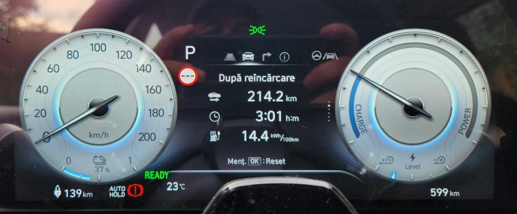 Ne place enorm. O conducem cu ușurință și plăcere. În oraș (Dezmir – Cluj), consumul e sub 12 kWh/100 km, uneori chiar 5,8 kWh în coborâre. Eu prefer i-Pedal, soția regenerarea pe treapta 3.