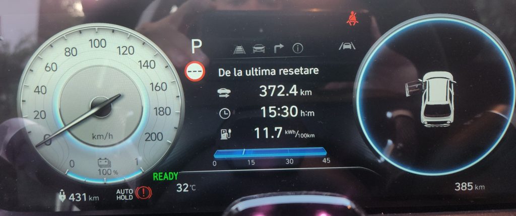 Am făcut și un drum extraurban: Cluj – Alba Iulia (~200 km dus-întors, 85% autostradă). Pilot automat la 110 km/h, toate automatizările active. Confortabil, liniștit, consum de 14,4 kWh/100 km. Bateria a scăzut de la 100% la 37%, încărcată gratuit de la soare.